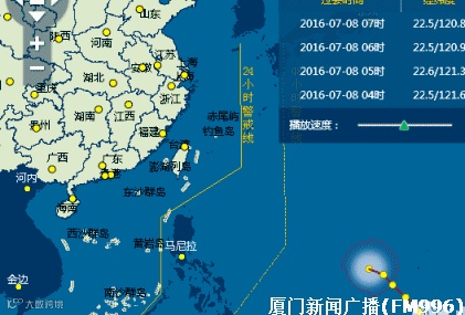 厦门市气象台2016年7月8日13时50分继续发布台风黄色预警信号:今年第1号台风“尼伯特”(强台风级),今天13时中心位于北纬23.0度,东经120.2度,目前位于台南市境内,中心气压950百帕,近中心最大风力14级(45米/秒)。