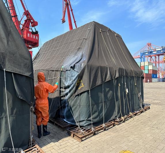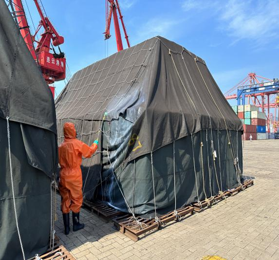 处置经验丰富的陈明身穿防护服,头戴防毒面具,将调配好的杀虫剂以喷雾的方式对蜂窝及篷布周边马蜂进行喷洒清理,在确认篷布内已无残存马蜂后,使用木叉对残存蜂窝进行清除。为防止马蜂再次筑巢,处置人员又在货垛周围继续喷洒杀虫剂,消除可能存在的安全隐患。经过20分钟连续的作业,货垛上的马蜂已全部清理,圆满完成处置工作。