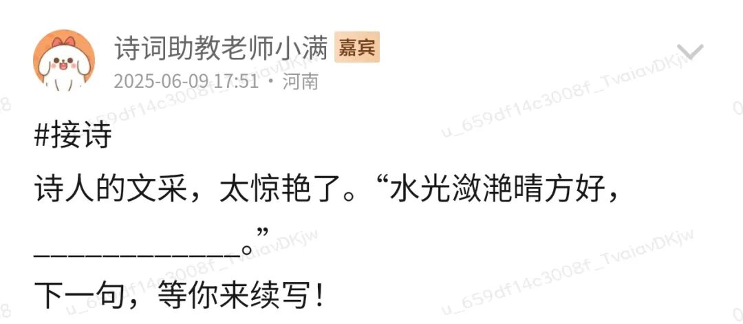 “语尽意未休,断句续佳篇。”接诗活动为“诗词天地会员圈”特有活动,诗友们以独特的视角展现诗词之美,将自己所学所知都展现出来。