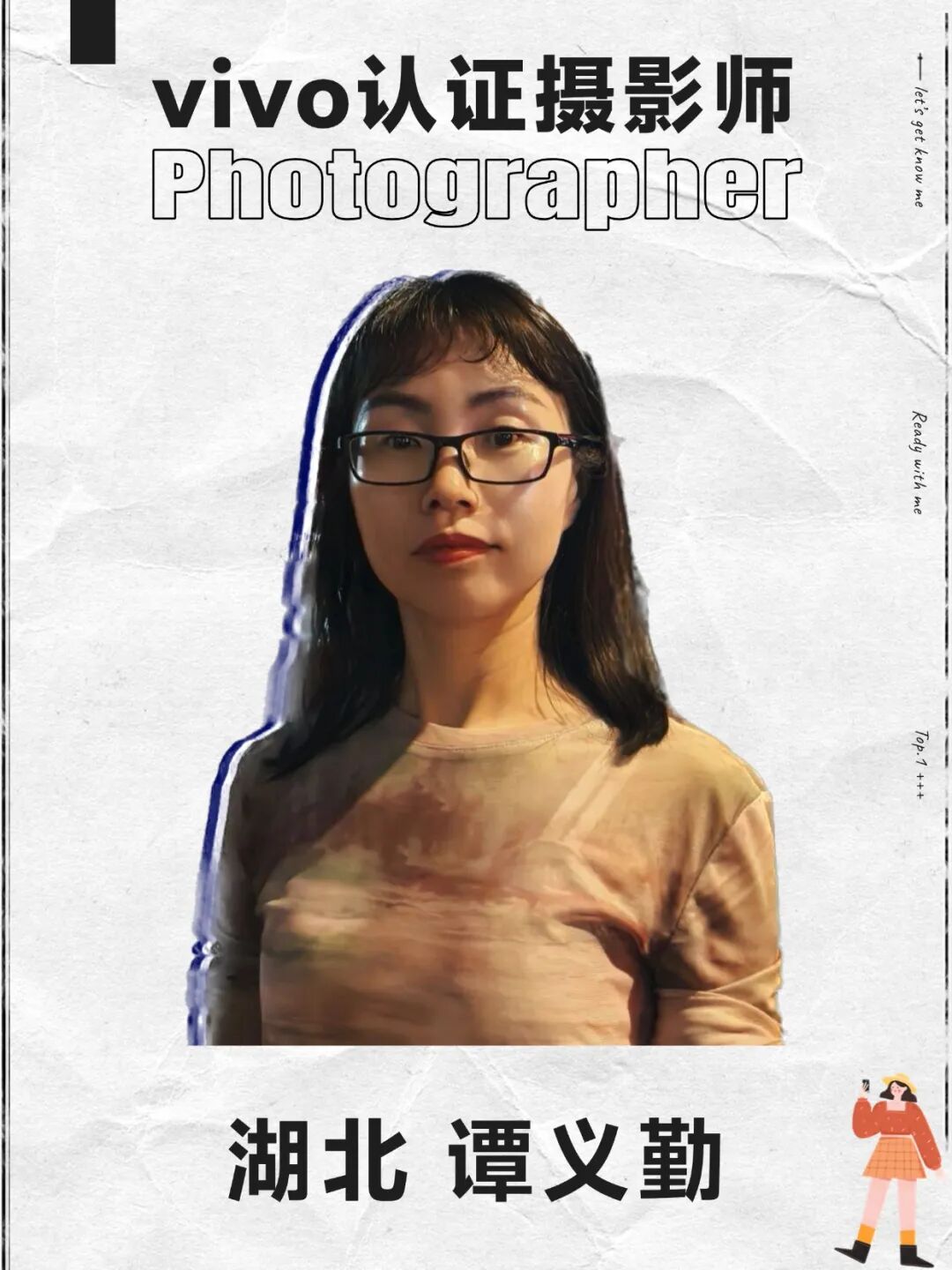 一级培训师,酷爱摄影,尤其擅长人像摄影。她是一个重庆辣妹儿,也是一个顶着40多度高温天气外出就为了拍一组照片的狠人,重庆的街头巷尾都有她和vivo的足迹,山城的高温也见证着她对摄影的热爱。