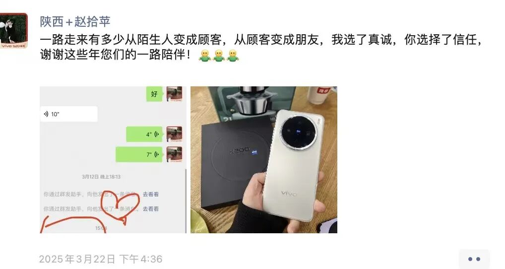 ——“还有一位老顾客,看我在朋友圈经常发美照,换机时就来找我买X200 Pro了。其实她初次找我买手机时沟通很不顺畅,砍价特别狠还要很多礼品,我费了九牛二虎之力才成交。有了这次的不愉快,我估计她后面不会再来了,没想到后来每次换机她都来找我,成交也特别爽快。我问她为什么这么信任我,她说能看出来我不是那种虚假的销售,每次来店里都能感受到我真诚待人的心。”