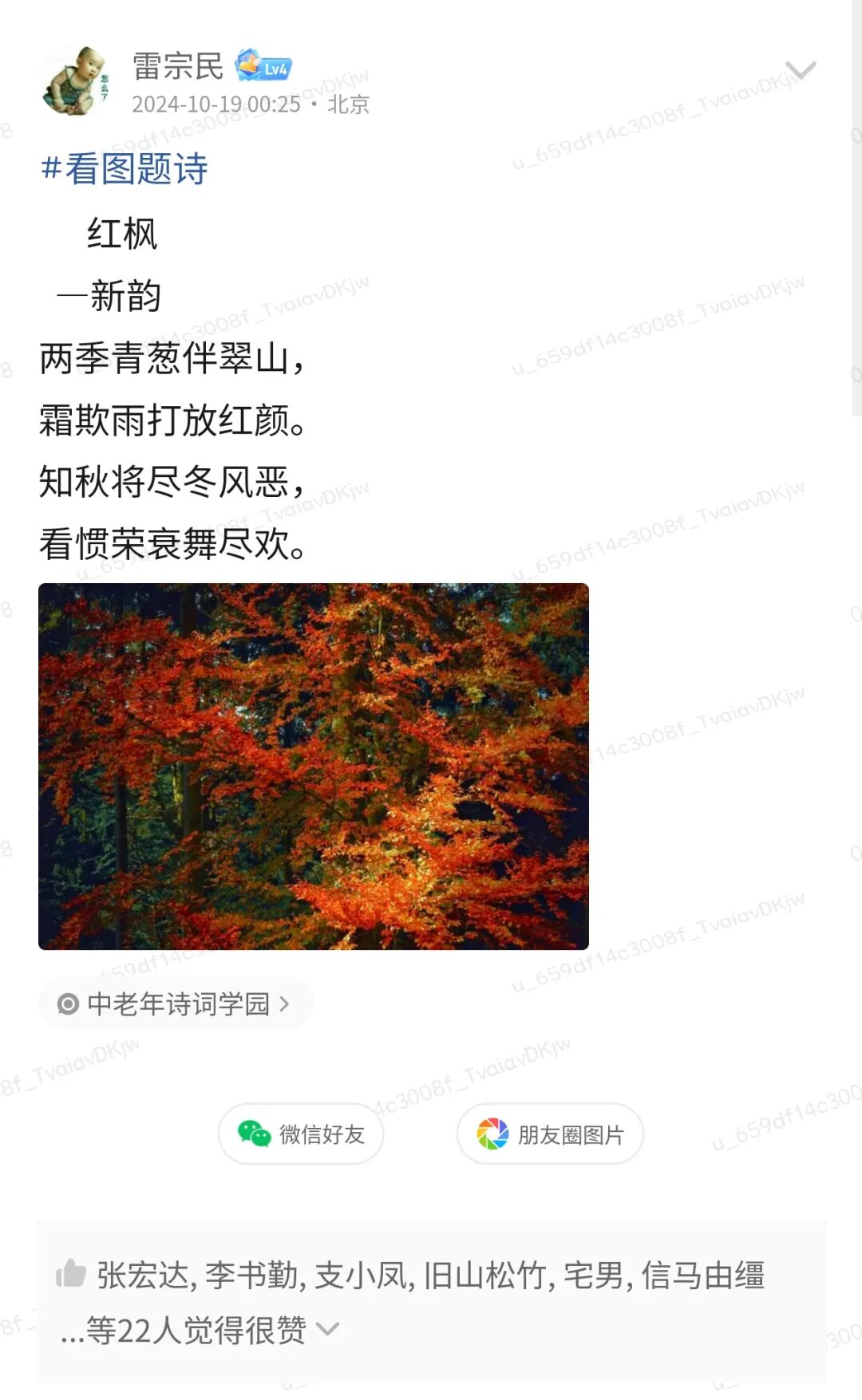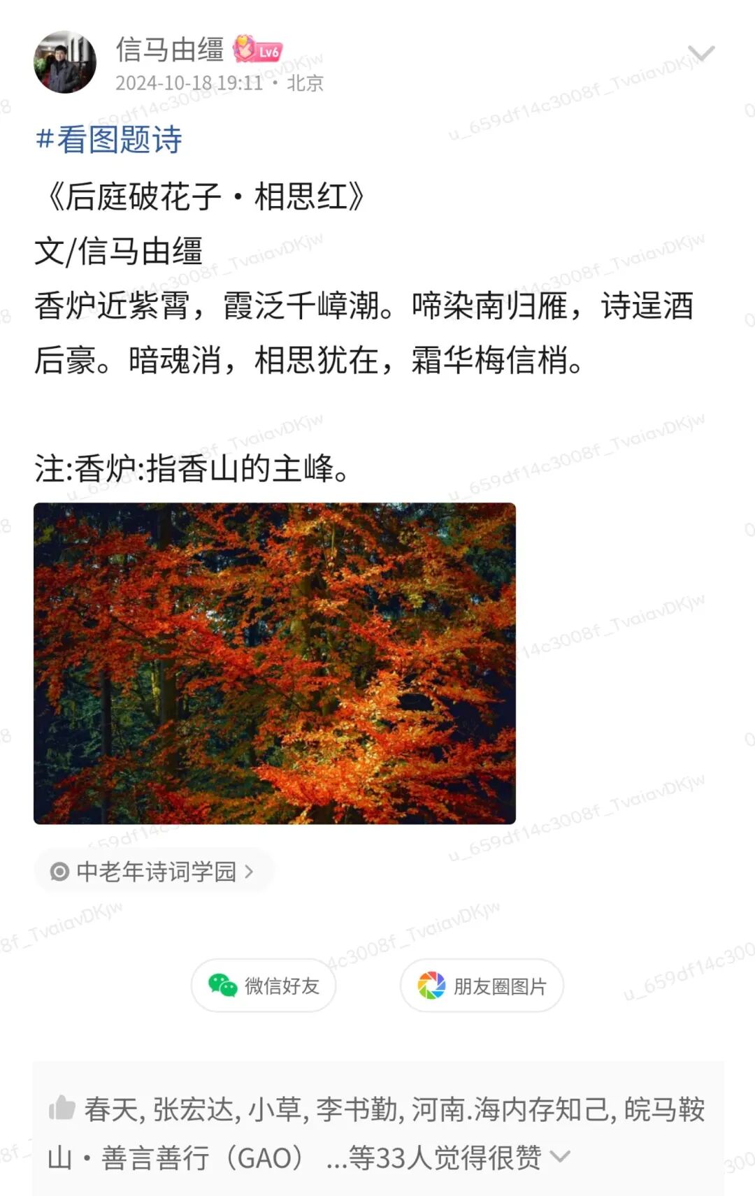 恭喜 信马由缰 会员诗友,在上周五看图题诗取得点赞数第一的成绩,获得称号“题诗神手“。