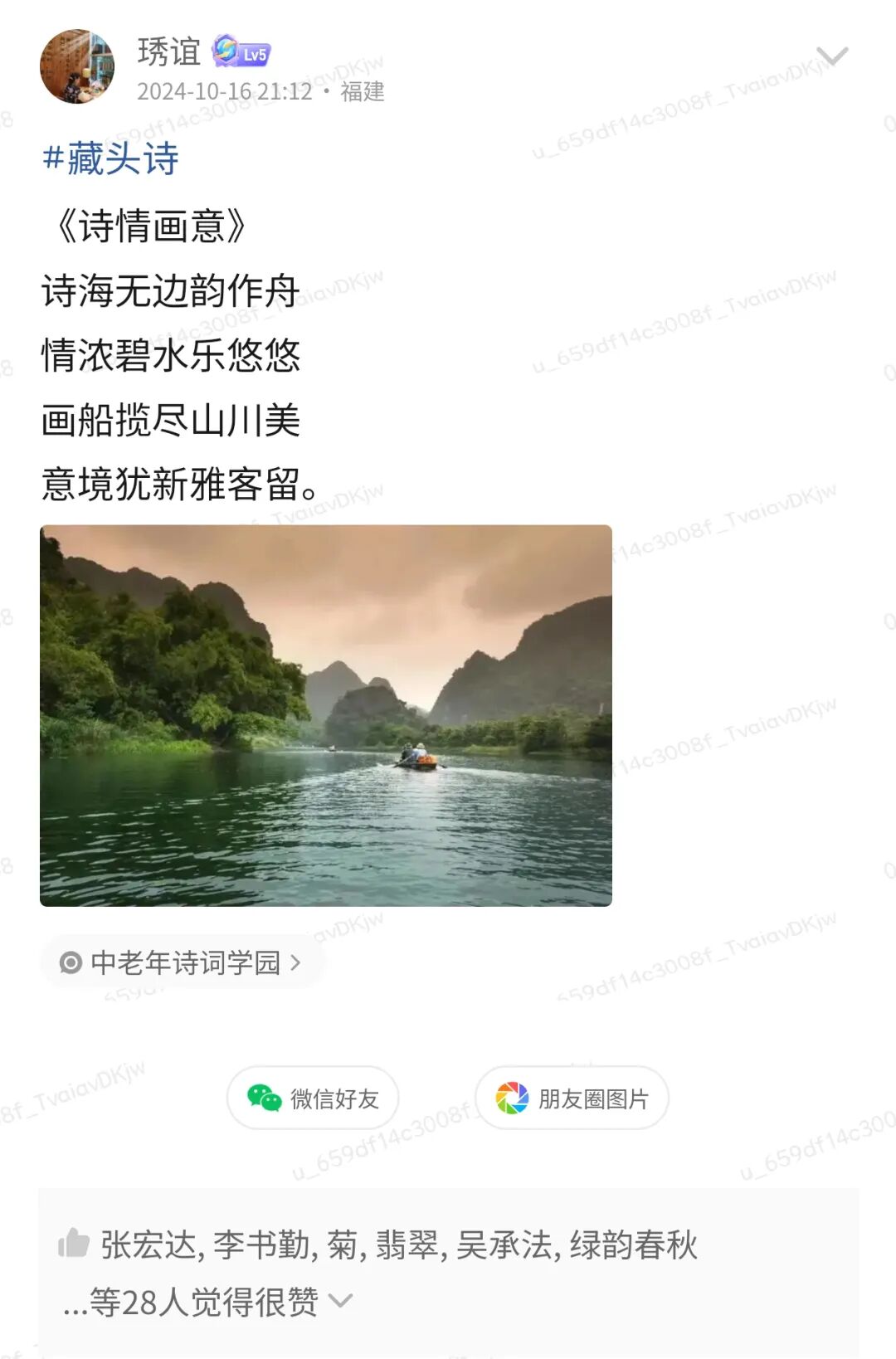 古往今来,藏头诗一直是文人爱好者所喜爱的,也创造出无数佳作,因此诗词天地也把“藏头诗”、“看图题诗”作为会员圈经典特有活动之一,每周一、三、五记得来参加!