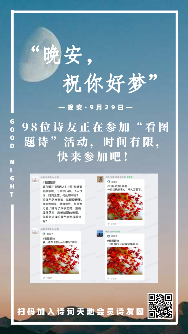 晚安海报丨98位诗友正在参加“看图题诗”活动,时间有限,快来参加吧!