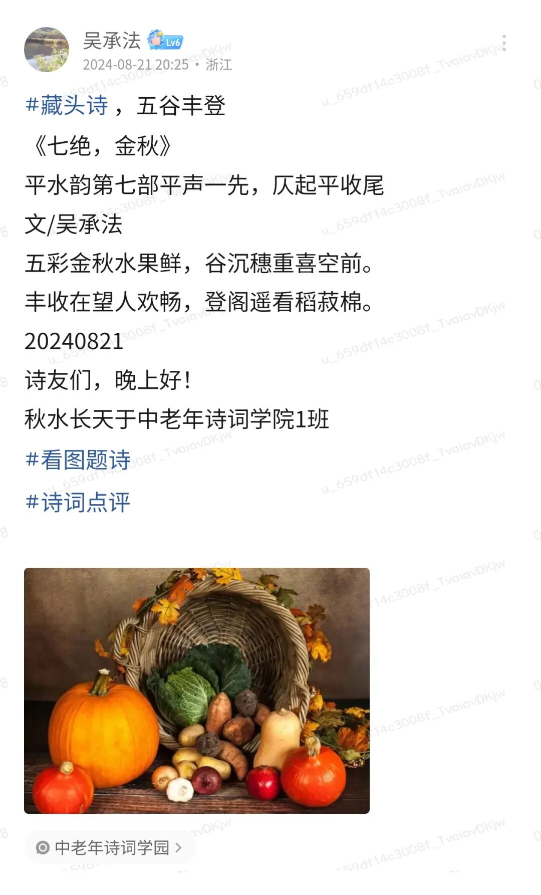 古往今来,藏头诗一直是文人爱好者所喜爱的,也创造出无数佳作,因此诗词天地也把“藏头诗”、“看图题诗”作为会员圈经典特有活动之一,每周一、三、五记得来参加!