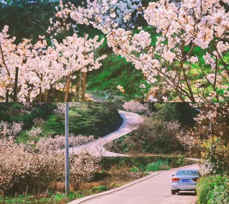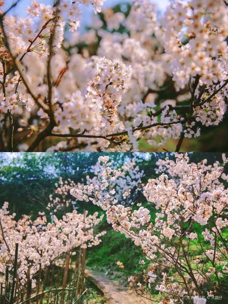 璧山八塘镇的樱桃花名气不小,每年春初开放时,樱桃采摘基地中上千亩樱桃花从山脚次第绽放,洁白淡雅的花朵如同潮水一般,春色盎然,春风一吹,便纷纷扬扬落下,“香雪海”一般的场景,当真美不胜收。