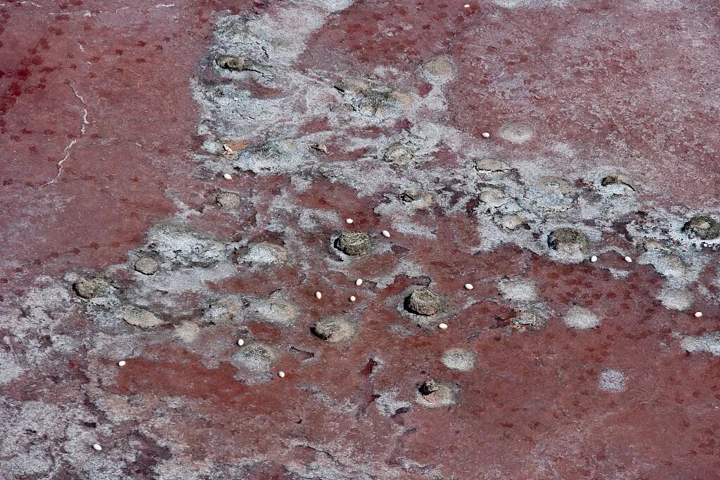 干涸季节时,湖中会形成很多小型的盐礁石,火烈鸟会在盐礁上铸巢,但若是不慎掉到河里,哪怕是火烈鸟也难逃被石化的命运。