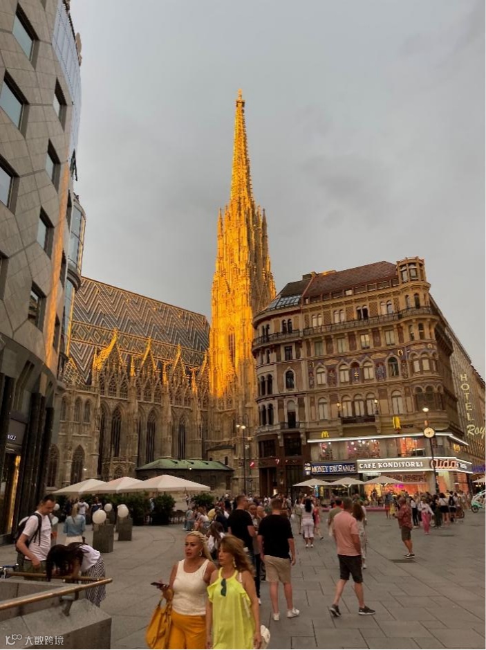 傍晚时分,我们漫步到位于维也纳市中心的史蒂芬广场,著名的地标性建筑史蒂芬大教堂正位于此。作为维也纳的城市标志之一,这座哥特式教堂的建造耗时四百年,完美呈现着不同建造时期的不同建筑风格,罗马风格的正门,巴洛克式的内饰,哥特式的尖塔,共同组成了这一维也纳的“心脏”。