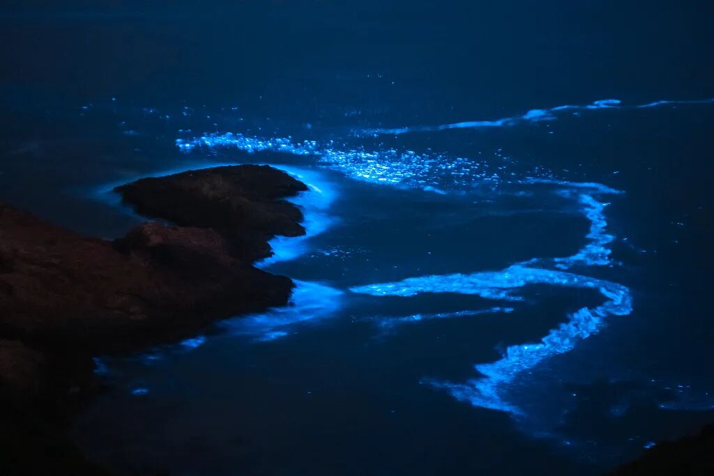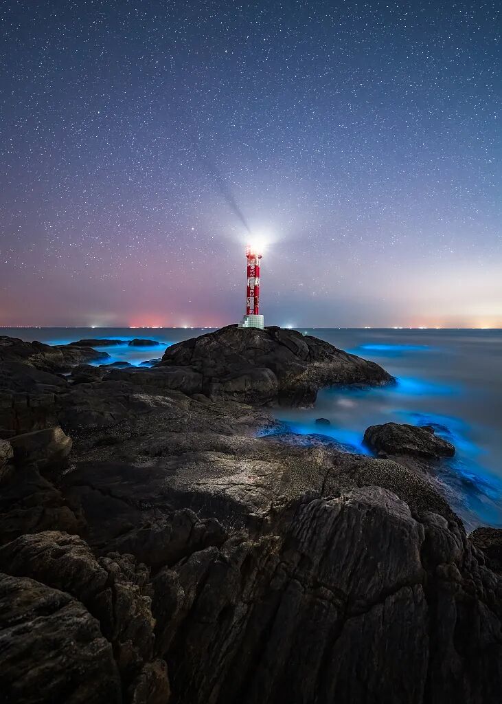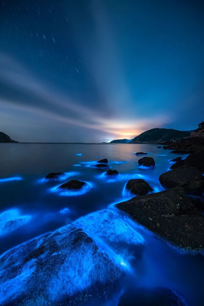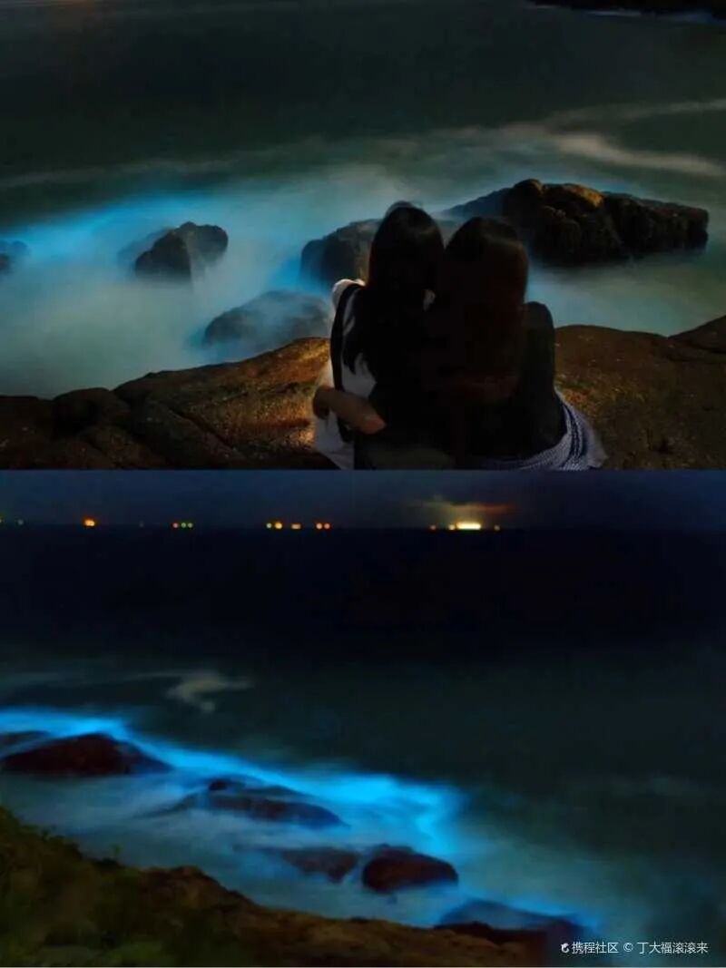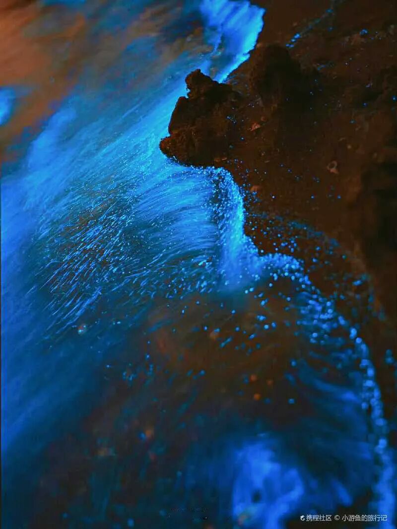 夜幕降临,海浪中点点荧光蓝显现出来,随着波浪拍打在礁石上,抬头是点点星空,低头是忽近忽远的蓝。