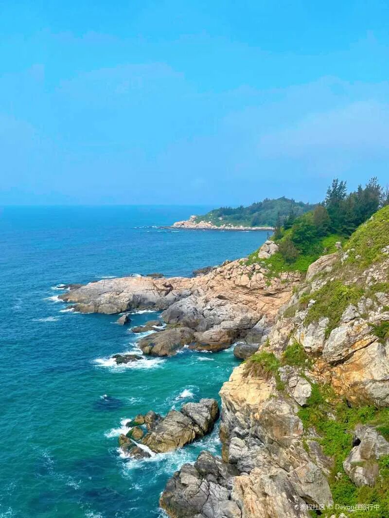前方是蔚蓝的大海,后有茂密的丛林,千奇百怪的礁石洒落在沙滩上,渔船在海面上来来往往,沿海的礁石酒吧吸引着众多年轻人,双月湾的南海渔港风光便呈现在眼前。
