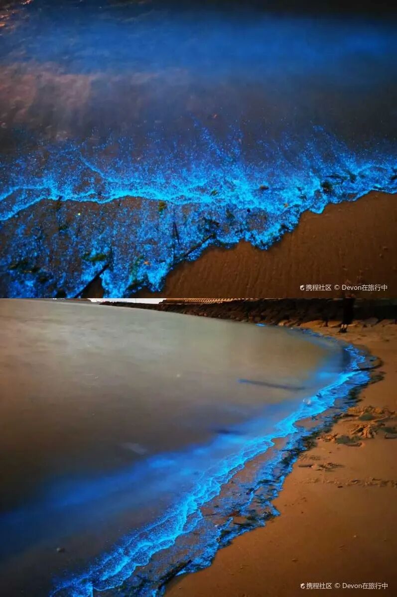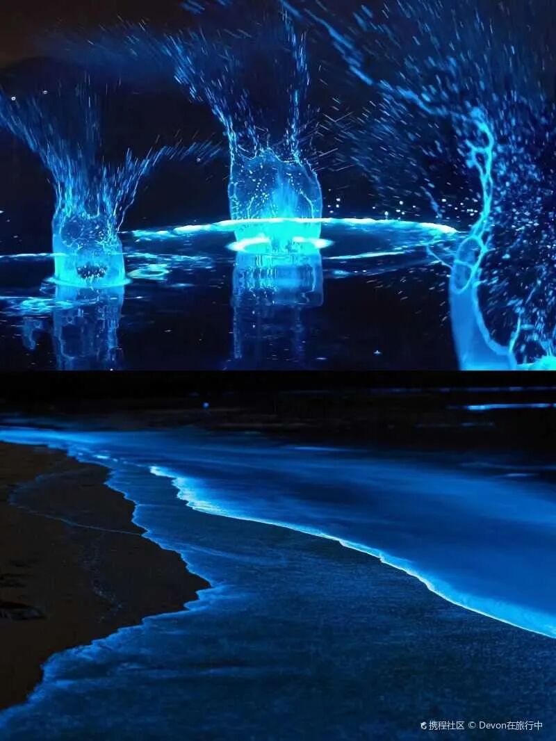 散发着蓝色光芒的海水与海岸边灯火辉煌的高楼,带来视觉上的反差与刺激,即使大多只在凌晨才能出现,这些地方依然让许多游人乐此不疲地熬夜等待。