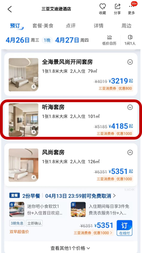 价值5185的套房使用消费券后优惠了1000元,