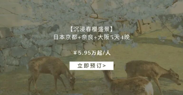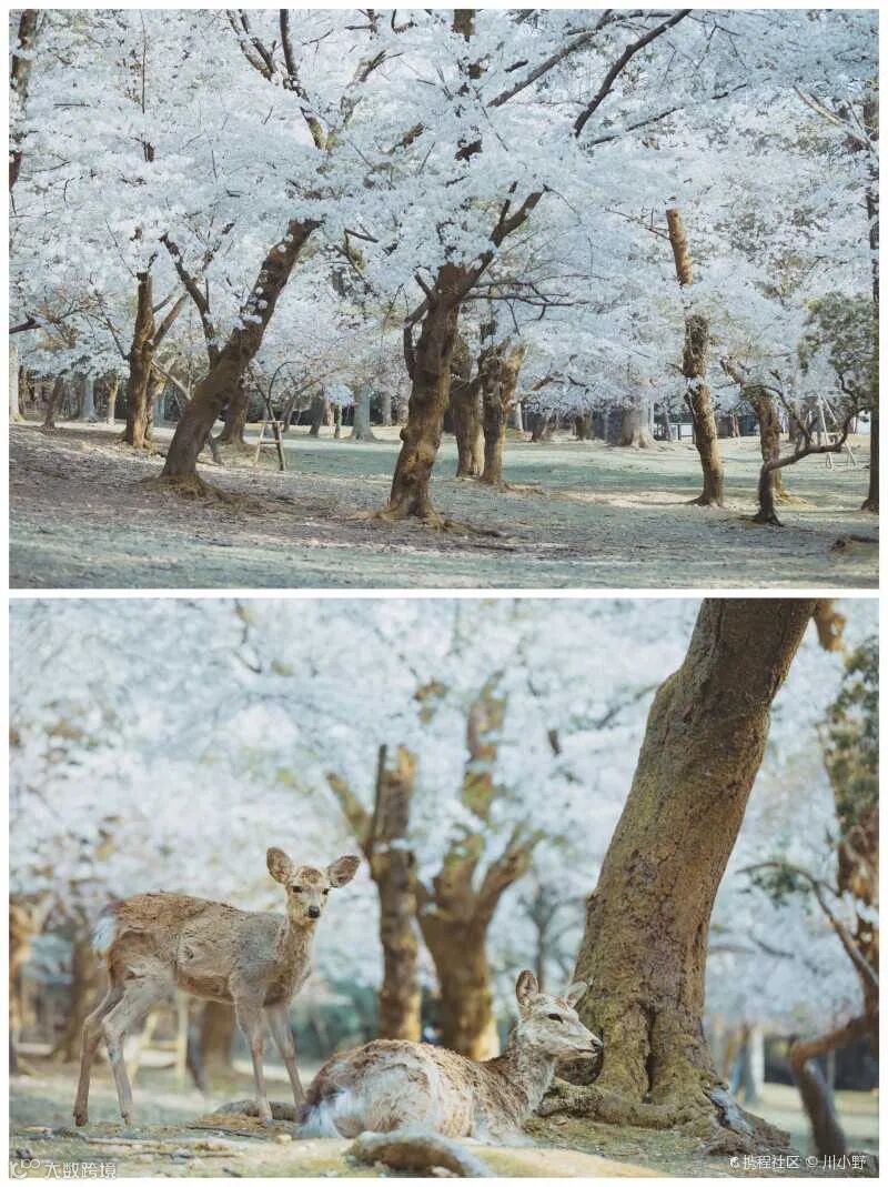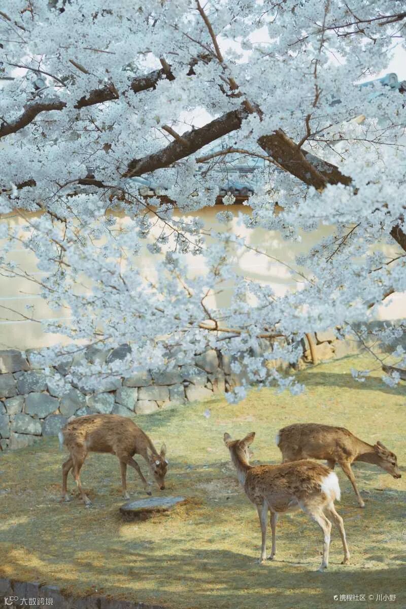 奈良公园,日本赏樱百选名所之一,春樱时节千株樱花盛开,粉白胜雪,小鹿如林间精灵一般穿行其中,文化与自然之美一览无遗。