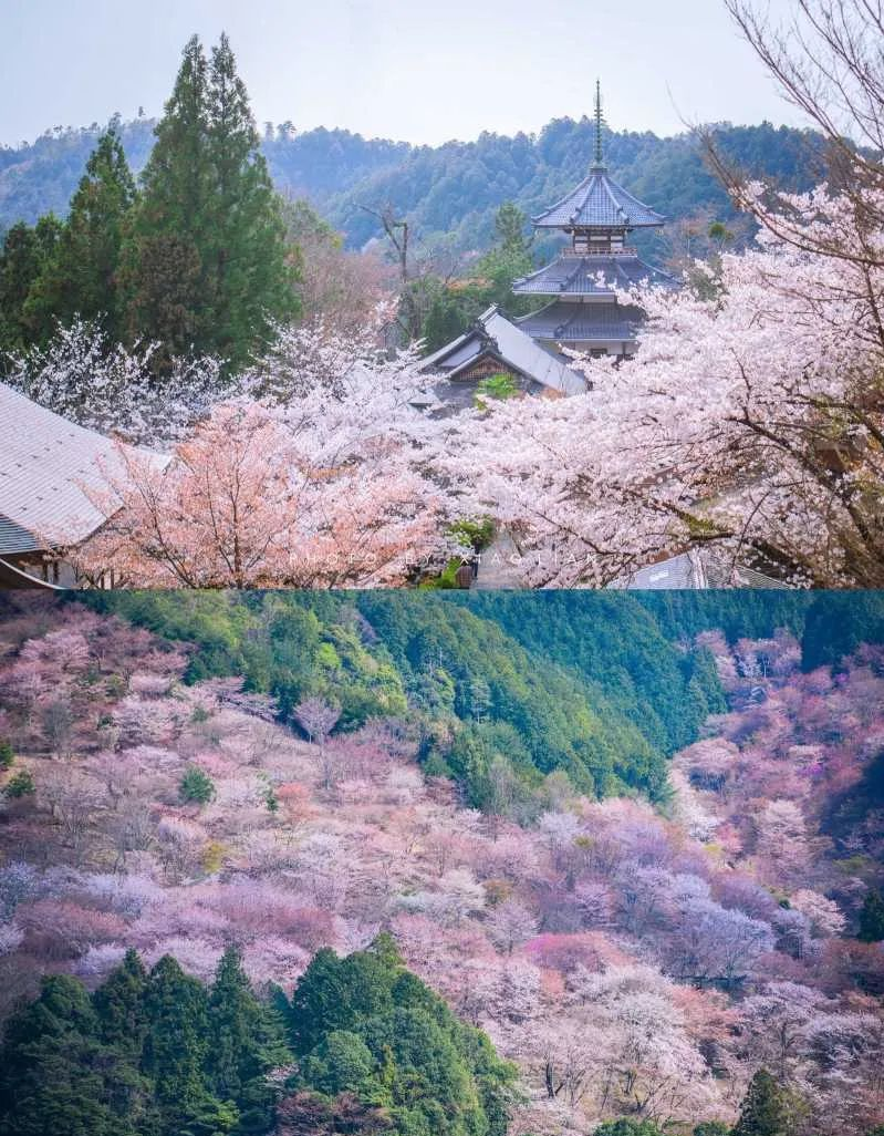 奈良吉野山从山麓到山顶遍栽樱花树,春来次第开放,樱花满山,就凭借这三万株樱花所营造的壮阔景致,这里自古便是日本首屈一指的樱花圣地。