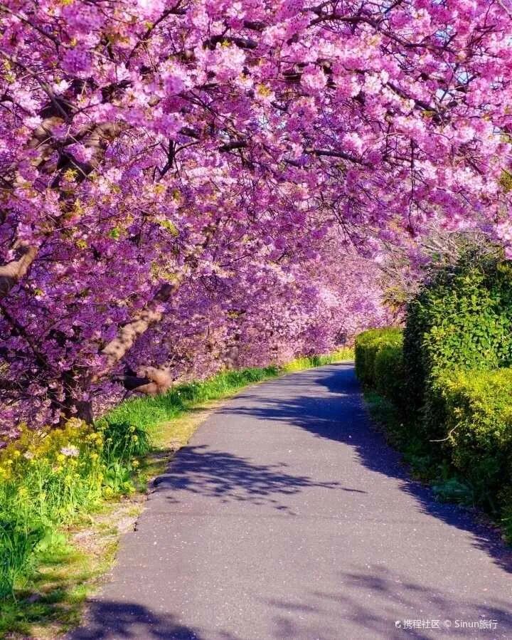 每年2月上旬,8000多株河津樱花沿河陆续绽放,浓烈的粉色和较大的花蕊是其特色,活力十足,非常适合拍照,花期大约有20-30天,几乎有1月之久。