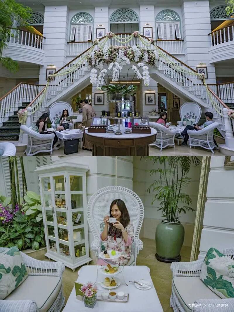 挑高的玻璃屋、泰国国花——兰花点缀的迎宾桌、泰式雕梁、南国白色扇形藤椅、竹枝绿植到处都散发着ins风的小清新气息。