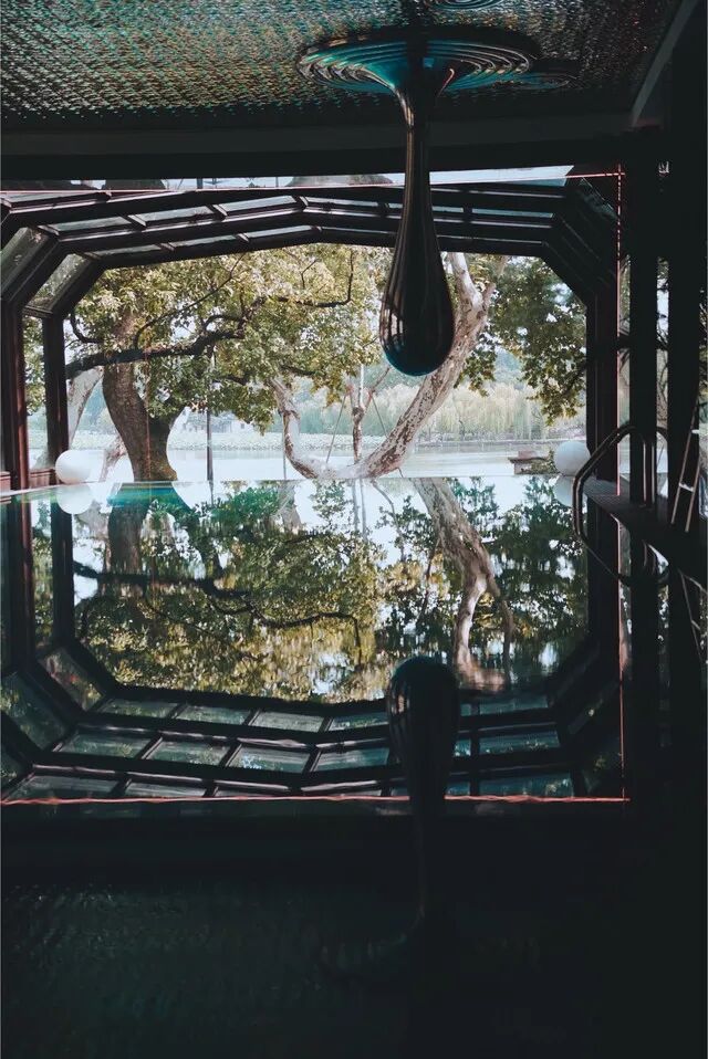 超魔幻的地方在于泳池边的玻璃和天窗可以完全打开,房顶可以伸缩,犹如与西湖相接,室内泳池瞬间转换成室外露天泳池,畅想西湖一线风光。