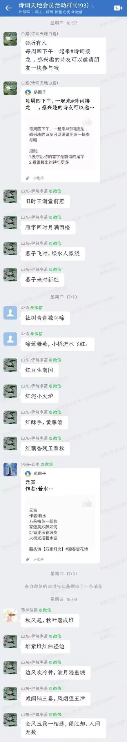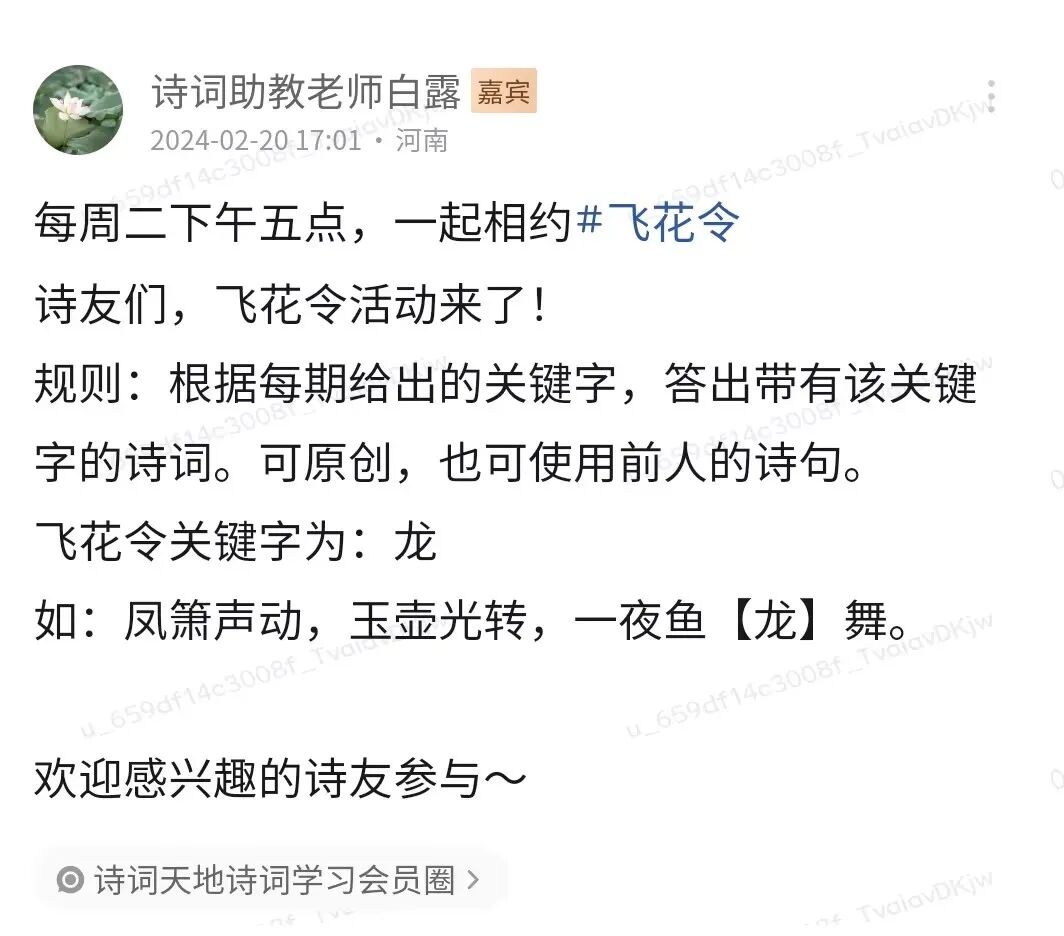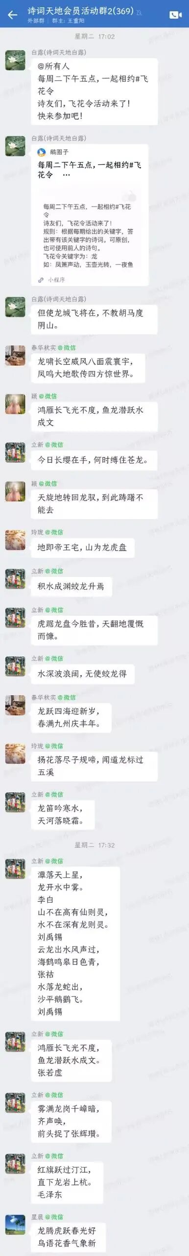 “诗词飞花令”,“诗词接龙”活动是诗词天地会员群内特有活动,分别于周二,周四在会员诗友圈内举行。