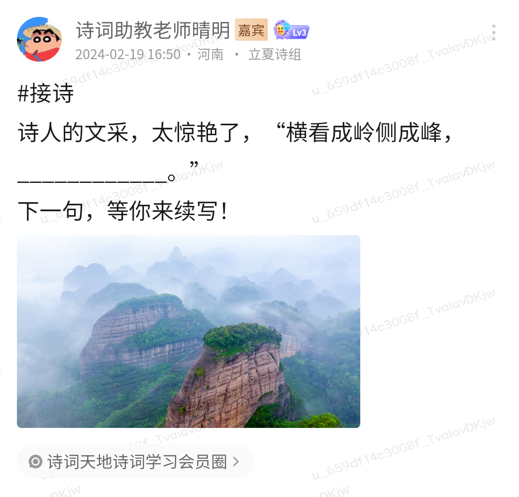 诗友的作品发在诗友圈,取得题诗点赞数第一的诗友获得“题诗神手”称号。
