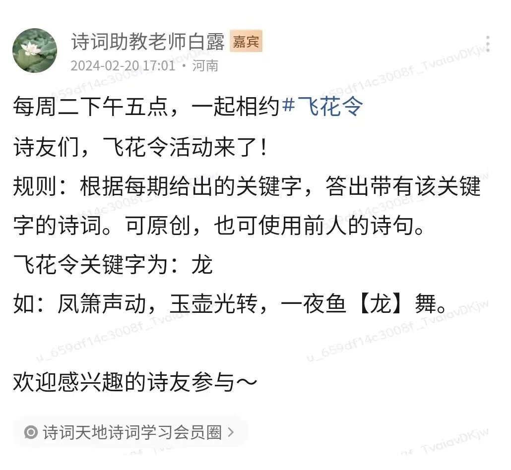 飞花令为每周二活动,对诗句没有较严格的要求,只需要答出含有主题字的诗句即可。