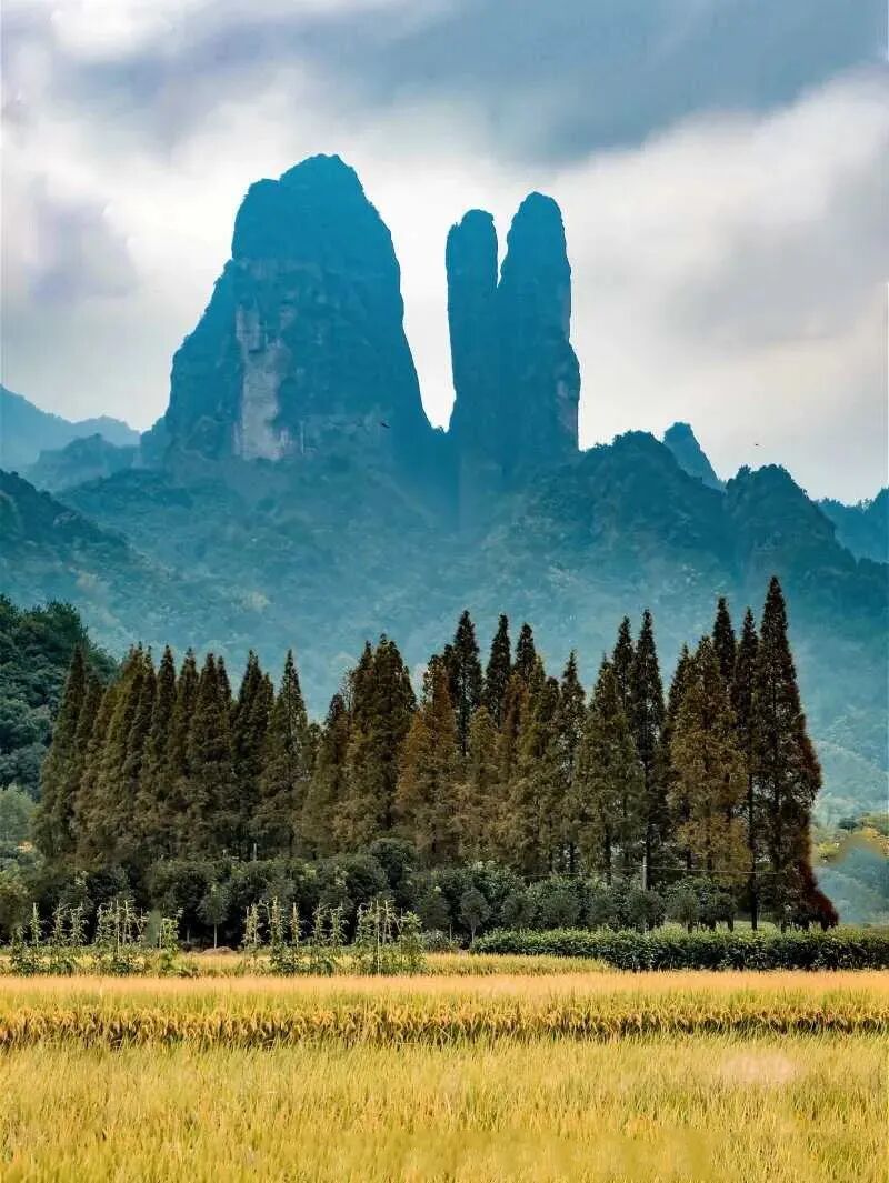 江郎山被誉为“神州丹霞第一峰”,由三座巨大岩峰拔地而起,自北向南呈川字排列,分别为郎峰、亚峰、灵峰,这里聚岩、洞、云、瀑于一山,雄伟奇特,蔚为壮观。