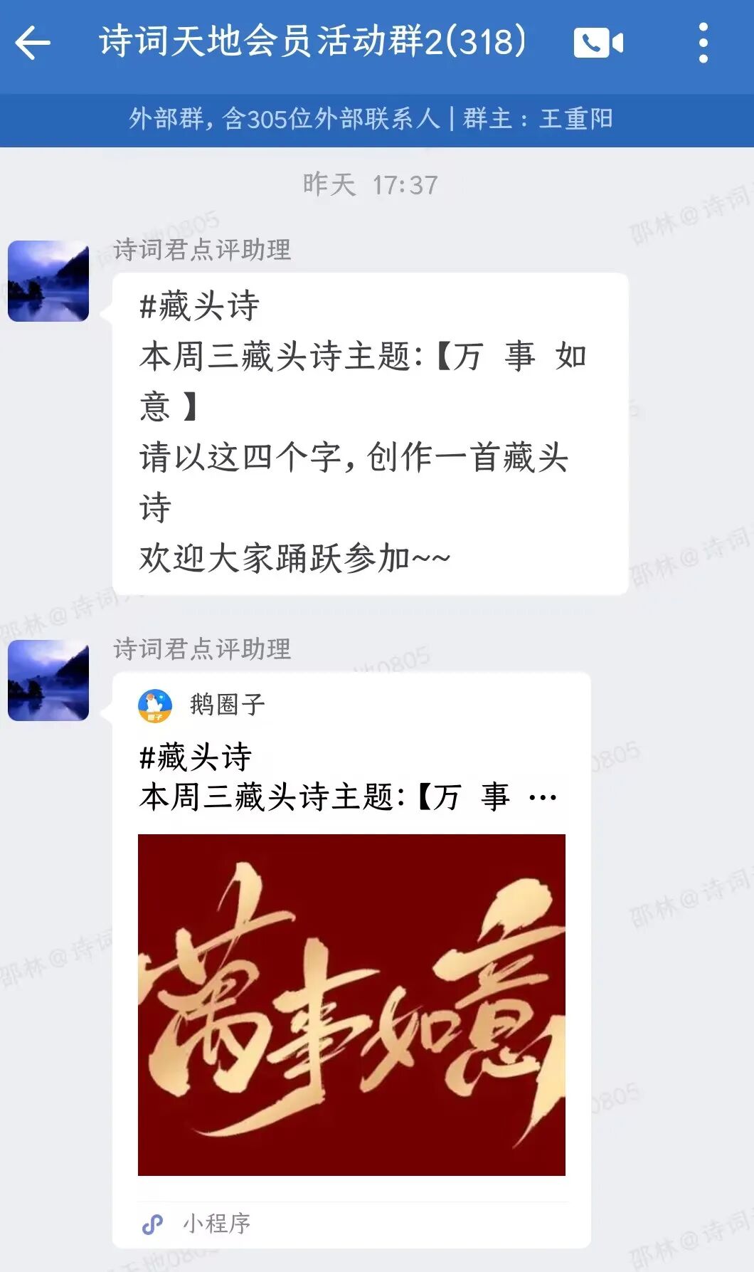 “藏头诗”、“看图题诗”活动是诗词天地会员圈特有的诗词活动之一,每周一、三、五在诗词天地会员圈举行。