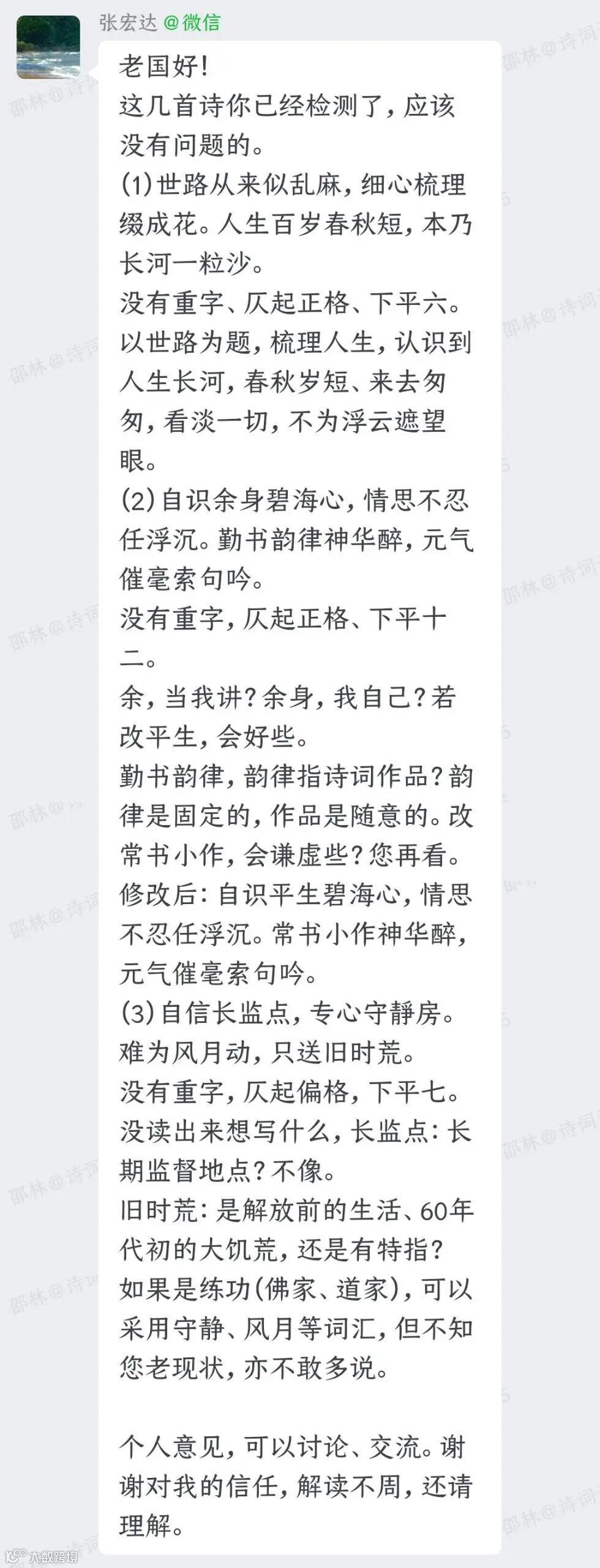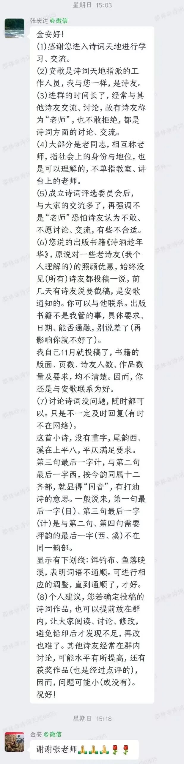 参加诗词天地、全国诗词大赛等多个项目的比赛、题图赋诗、同题诗等活动,撰写100多个词牌的词作品,对部分诗友的作品进行相应的评论,具备一定的诗词评论基础。很多诗友在写完诗词之后很愿意让其指导,张宏达先生在空余时间也会回复相关问题,指出优秀之处也提出可改进之处。