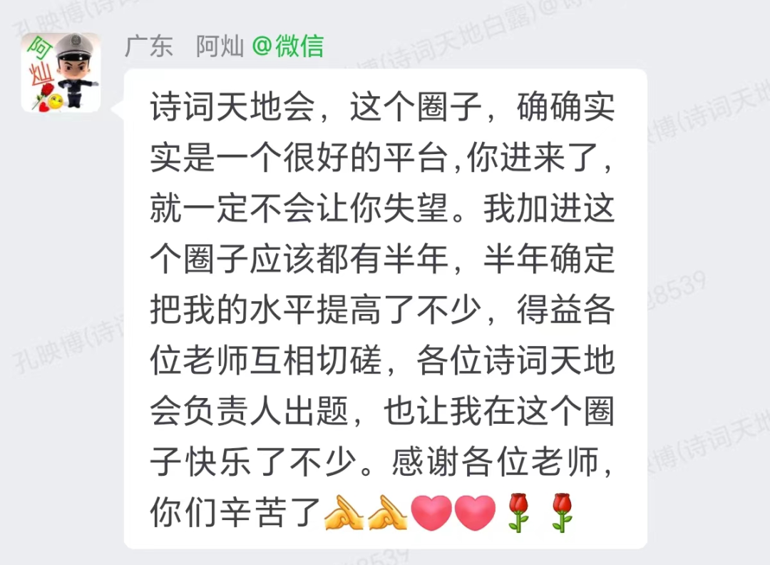 诗词天地会,这个圈子,确确实实是一个很好的平台,你进来了,就一定不会让你失望。我加进这个圈子应该都有半年,半年确定把我的水平提高了不少,得益各位老师互相切磋,各位诗词天地会负责人出题,也让我在这个圈子快乐了不少。