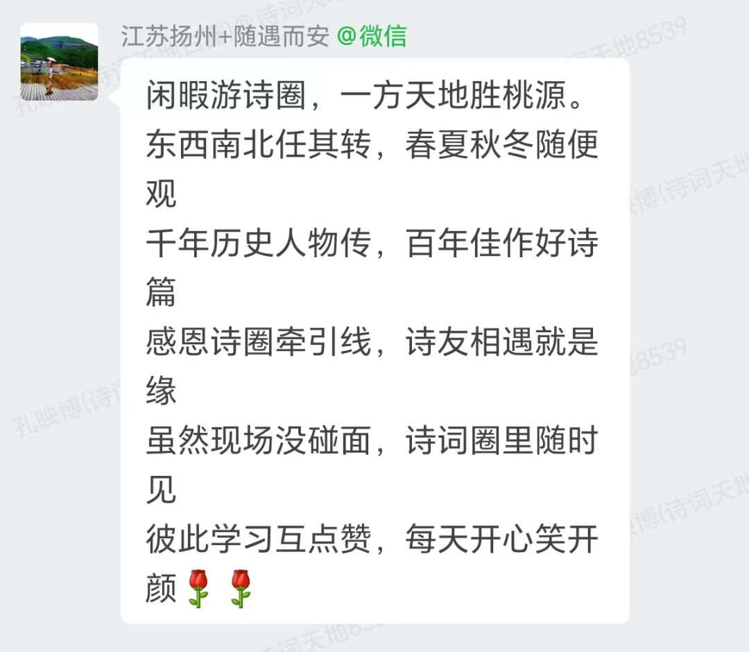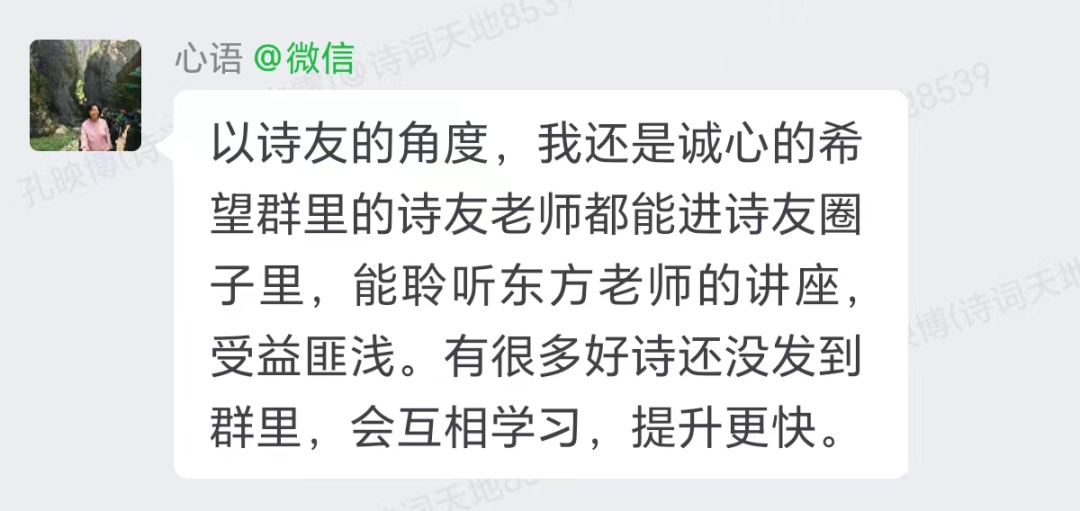 诚心的希望群里的诗友老师都能进诗友圈子里,能聆听东方老师的讲座受益匪浅。有很多好诗还没发到群里,会互相学习,提升更快。