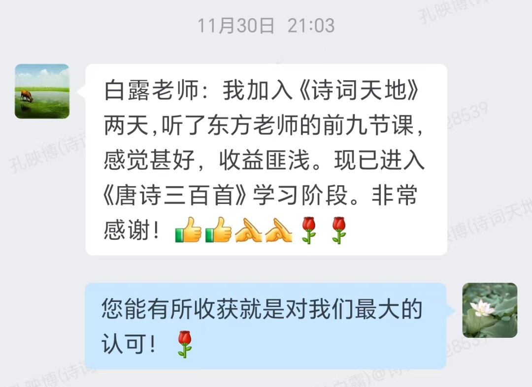 我加入《诗词天地》两天,听了东方老师的前九节课,感觉甚好,收益匪浅。现已进入《唐诗三百首》学习阶段。非常感谢!