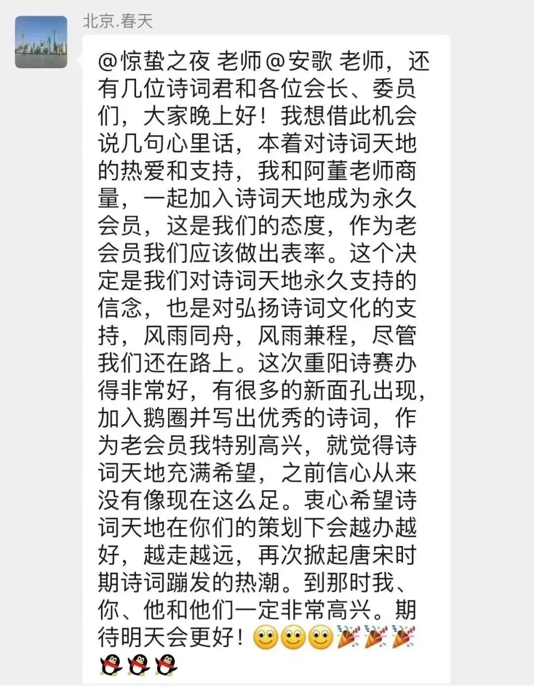 本着对诗词天地的热爱和支持,我和阿董老师商量,一起加入诗词天地成为永久会员,这是我们的态度,作为老会员我们应该做出表率。这个决定是我们对诗词天地永久支持的信念,也是对弘扬诗词文化的支持,风雨同舟,风雨兼程,尽管我们还在路上。