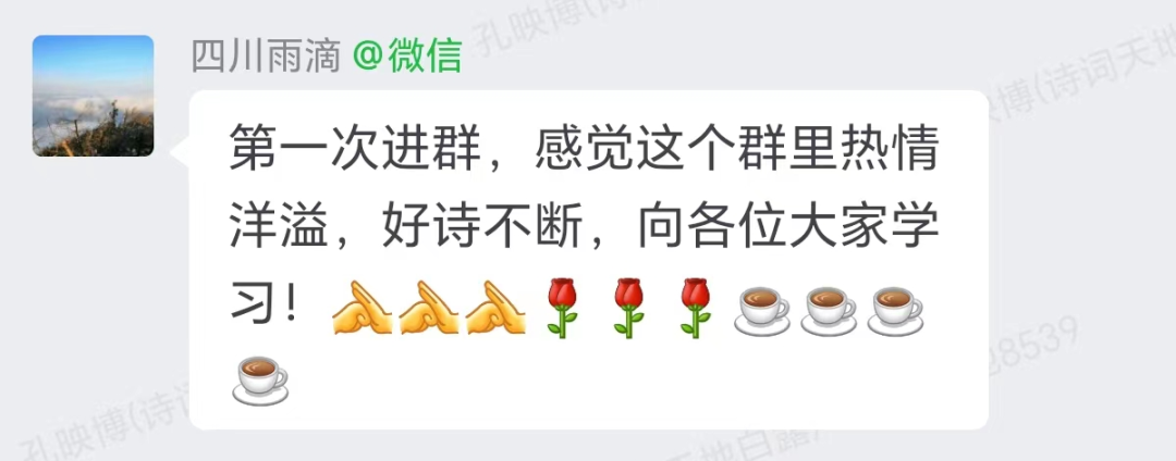 第一次进群,感觉这个群里热情洋溢,好诗不断,向各位大家学习!