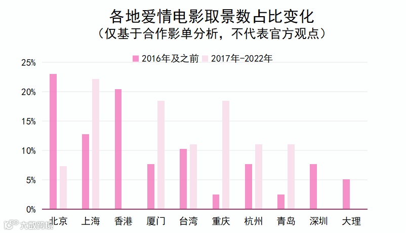 虽然目前北京、上海、香港仍然是取景数量最多的城市,但其实,国产爱情片的取景地,已经在慢慢发生迁移。