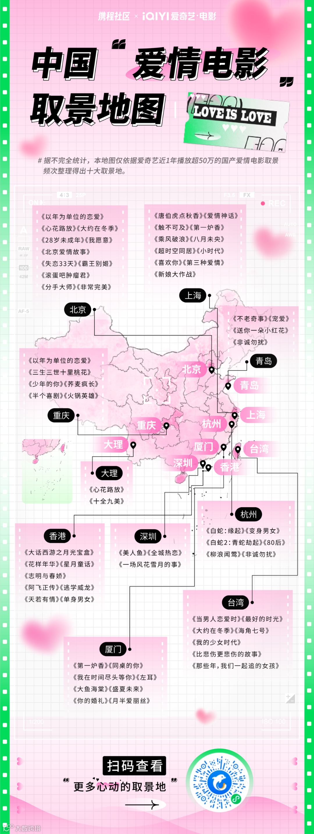 我们和爱奇艺电影频道一起,盘点了近1年播放量超50w的国产爱情电影,整理了这张浪漫地图,带上你的另一半,余生一起去打卡吧~