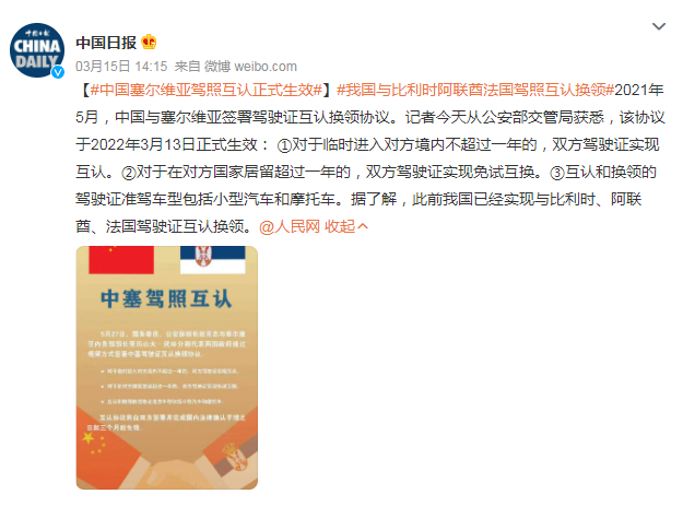 其实塞尔维亚并不是首个与中国驾照互认的国家,
