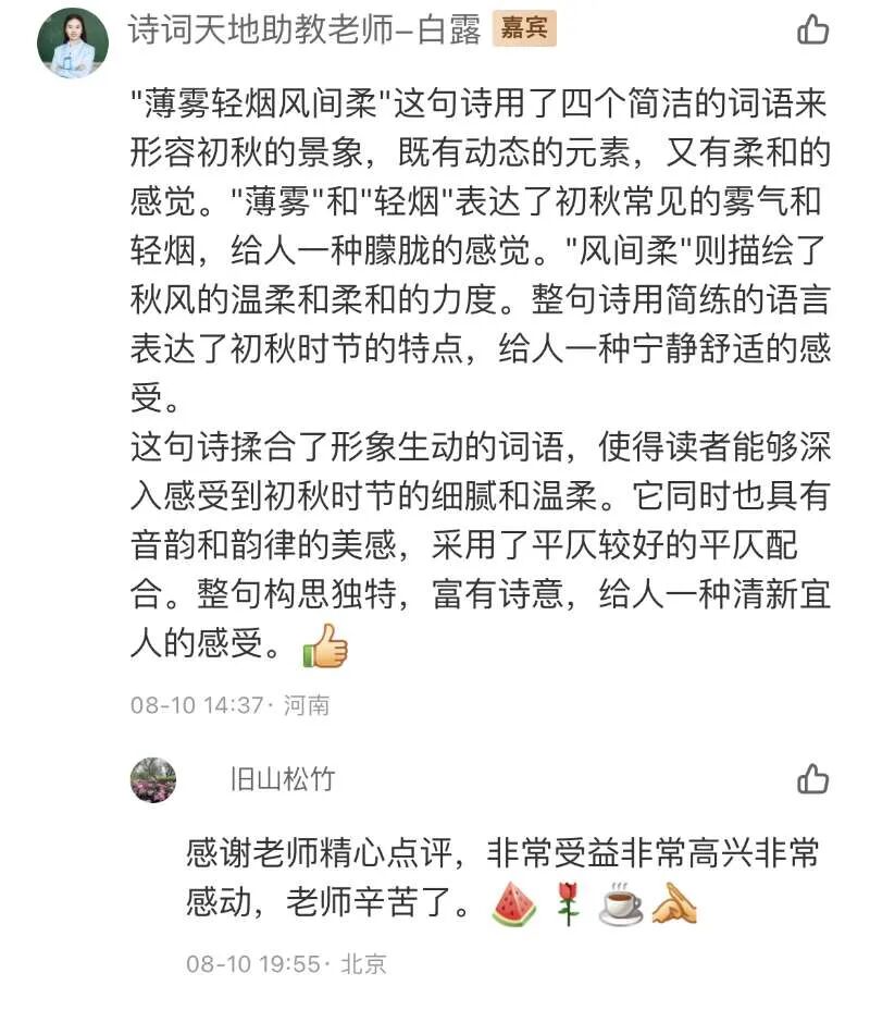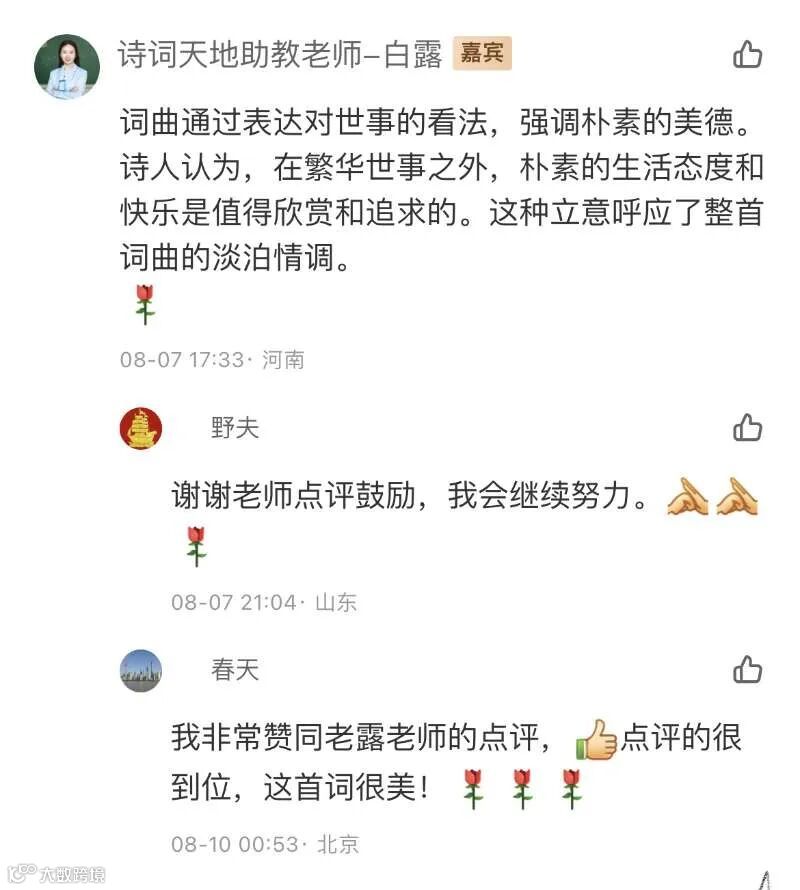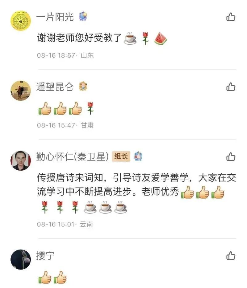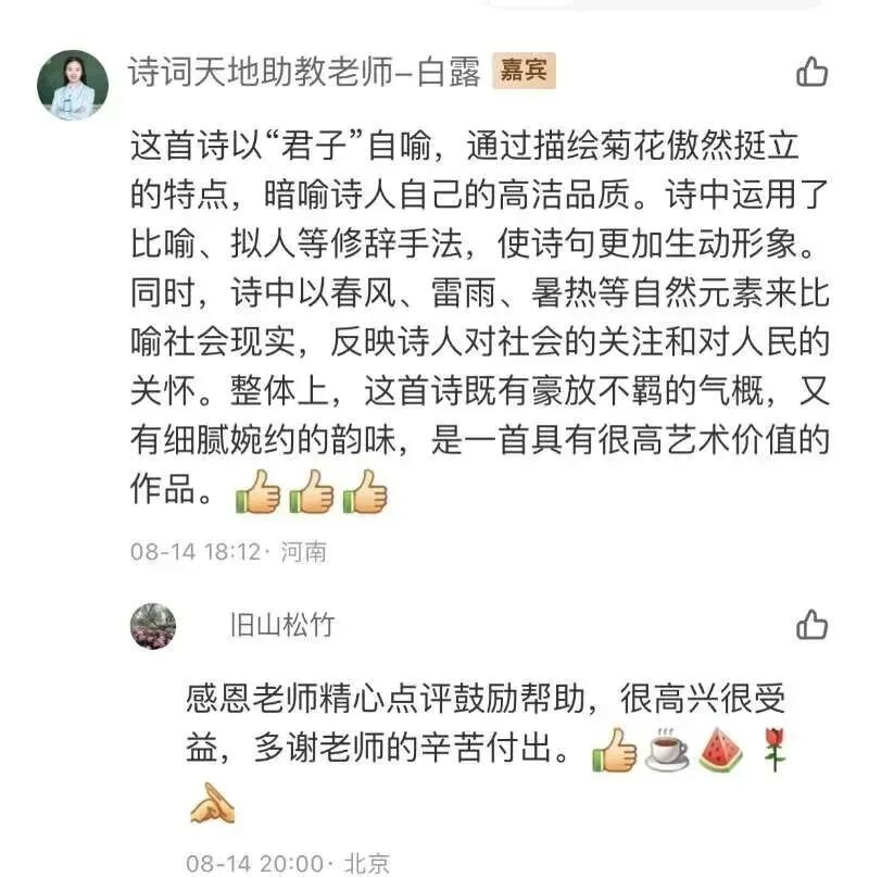 她的好友王阿姨好奇地问:“春天老师,你怎么这么会写诗啊?”春天老师眼中闪过一丝智慧:“我加入了【诗词天地会员圈】,每天都能听到那么多经典的古诗词,还能和九千多位诗友们交流,自然而然就被感染,也想尝试创作。”