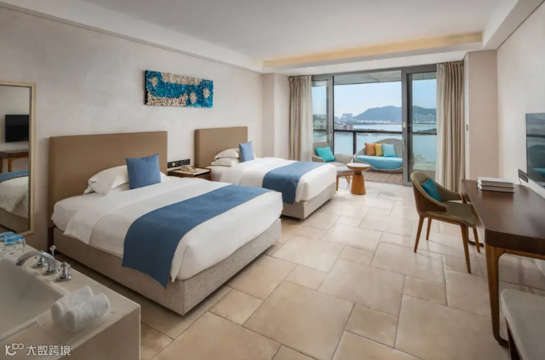 住的豪华海景双床房参考长下图这样,55㎡左右,自带海景露台,歇歇脚聊聊天,眼前就是大海,那一刻感觉自己整个人都被治愈了。