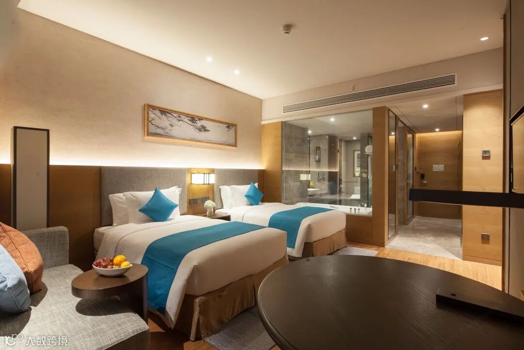 客房延续了酒店的优雅风,家具、灯具细节又将精致感拉满。房间面积也给的很足,像高级园景双床房有55-70㎡,带娃住也没有拥挤局促的感觉。