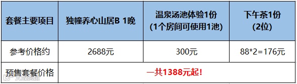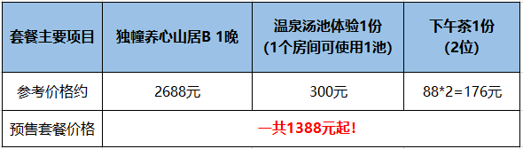 等秋意渐浓,天气渐凉,我们今天1388元起套餐,送的温泉汤池体验就派上用场了,如果自己单独买的话,得300元/池。