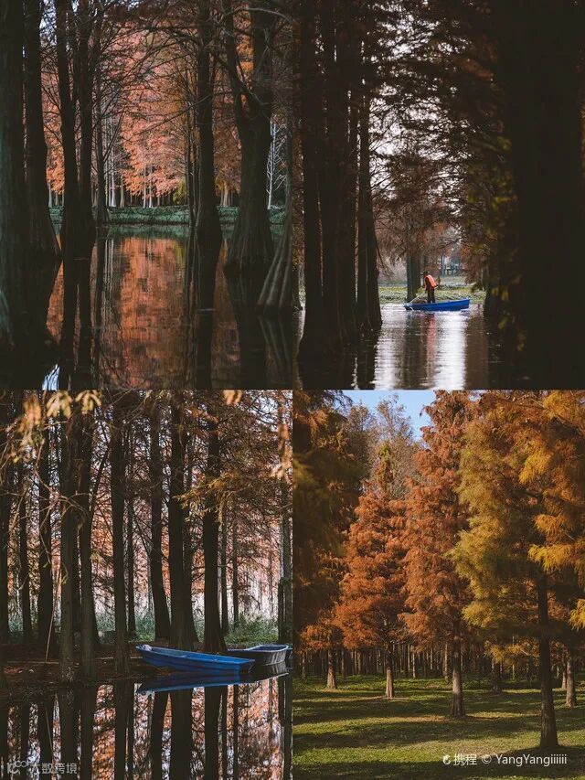 阳光透过树枝的缝隙洒落下来,五彩斑斓的水杉林像是秋冬打翻的调色盘,斑驳的树影倒映水中,折射出双份的迷人秋色,美不胜收!