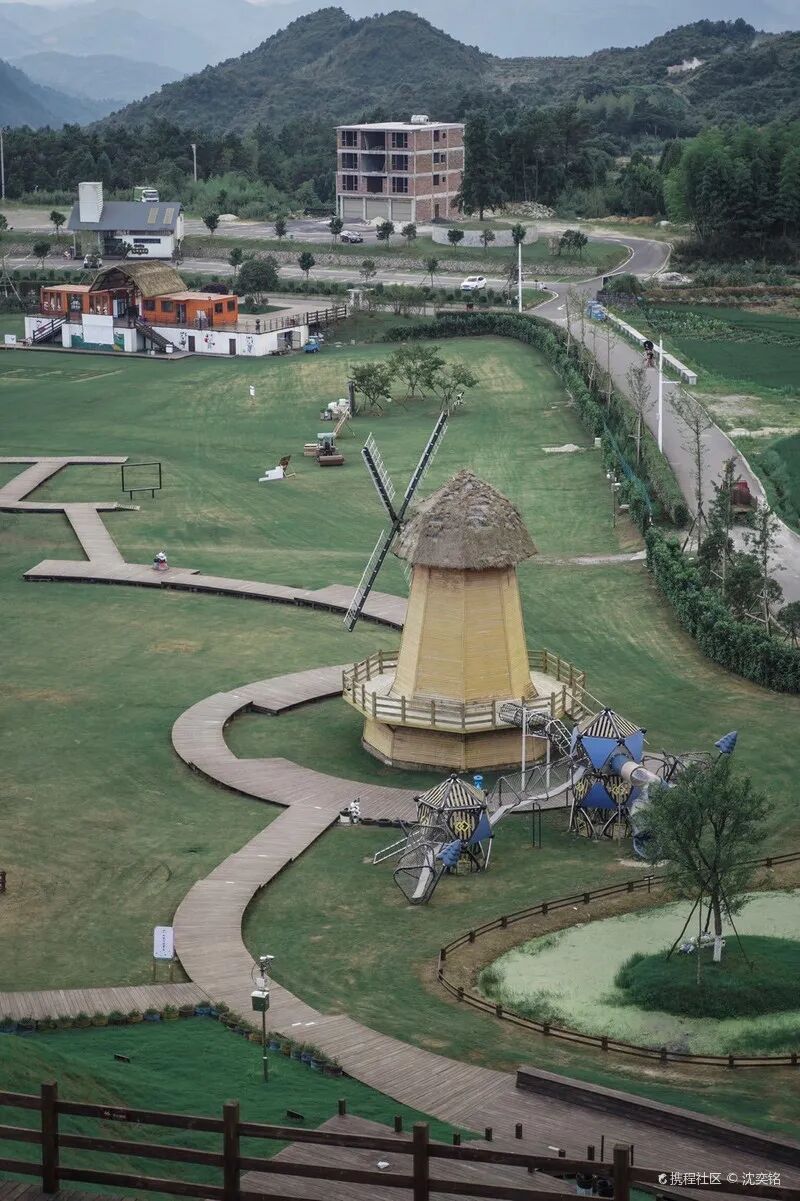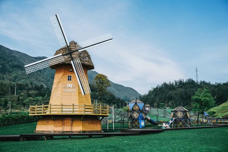 整片牧场都是绿草如茵,宛如铺上了一块巨大的绿色地毯,山间的风吹过,能够让人感觉到空气的清新,除此之外,草场上还搭建了大风车,小木屋,露营地,木围栏……童话的田园风光也不过如此了吧。