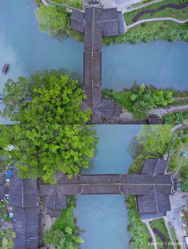 整座桥灰瓦红身,刻有飞檐走兽,霸气异常,整体气势恢宏,廊桥中还设有神龛,是供人们祭祀而用,桥旁还有古树掩映,桥下二水交汇,青山、碧水、廊桥、古树,交相辉映,为我们描绘出了一副完美的画卷。