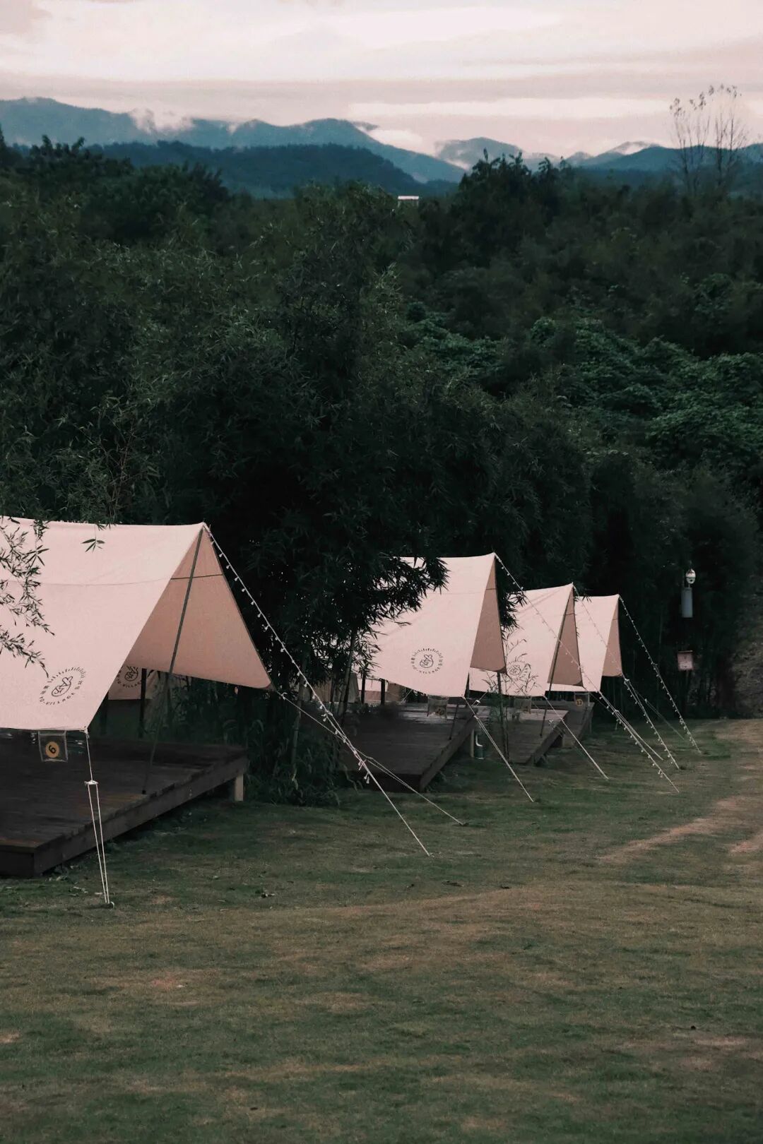 民宿对面,一条马路之隔则是小小部落,很多小姐姐钟爱的露营地,网红帐篷和尖顶小木屋一个不落。