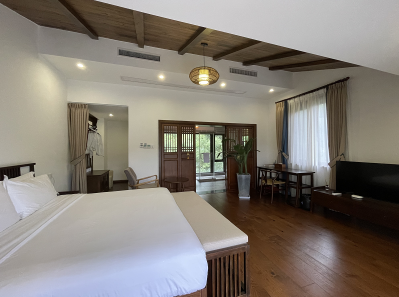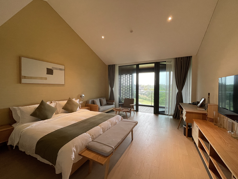 山脉景观大床房面积40㎡起步,新中式的木质调与纯白相间,显得优雅而迷人。