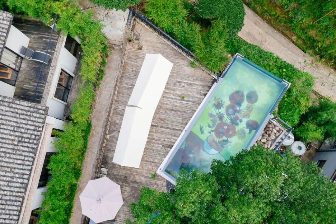汤池旁则是新修建的无边泳池,可惜遇到下雨天山里气温骤降,程老师我无法亲身感受了。上张俯拍视角,池底的向日葵也是主人老胡画的,致敬梵高。