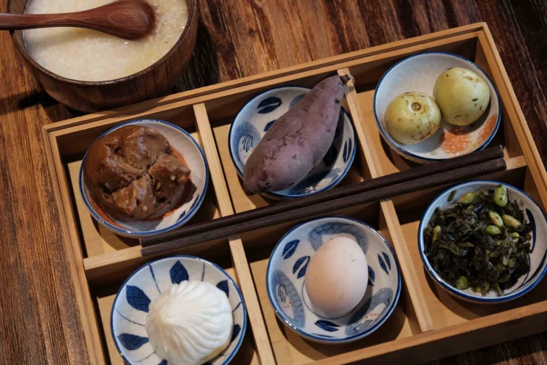 早餐为九宫格的定食,杂粮小菜,馒头白粥,尝的就是这一口鲜,这一口质朴。