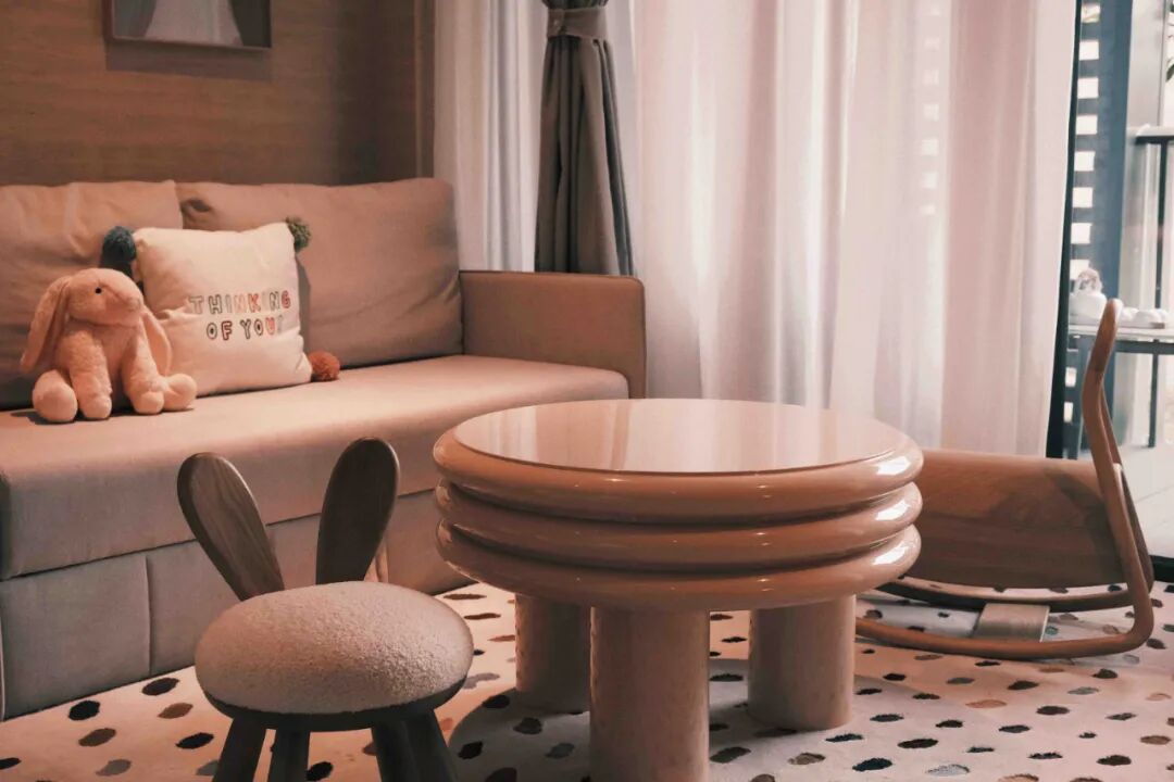 程老师被这个兔子床给萌到了!粉粉嫩嫩的兔子元素,火速抓住了大朋友小朋友的心,房间里还有小摇马,孩子玩耍,爸妈在阳台喝茶赏景,十分畅快。