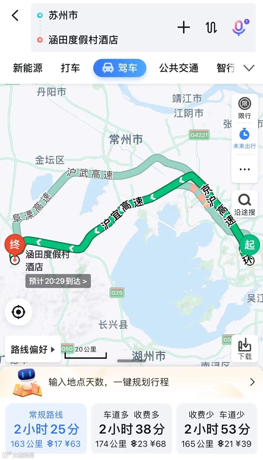 直接定位天目湖涵田度假村,苏州、杭州开车到酒店大概2.5小时,上海3小时,酒店有充电桩和免费的停车场。