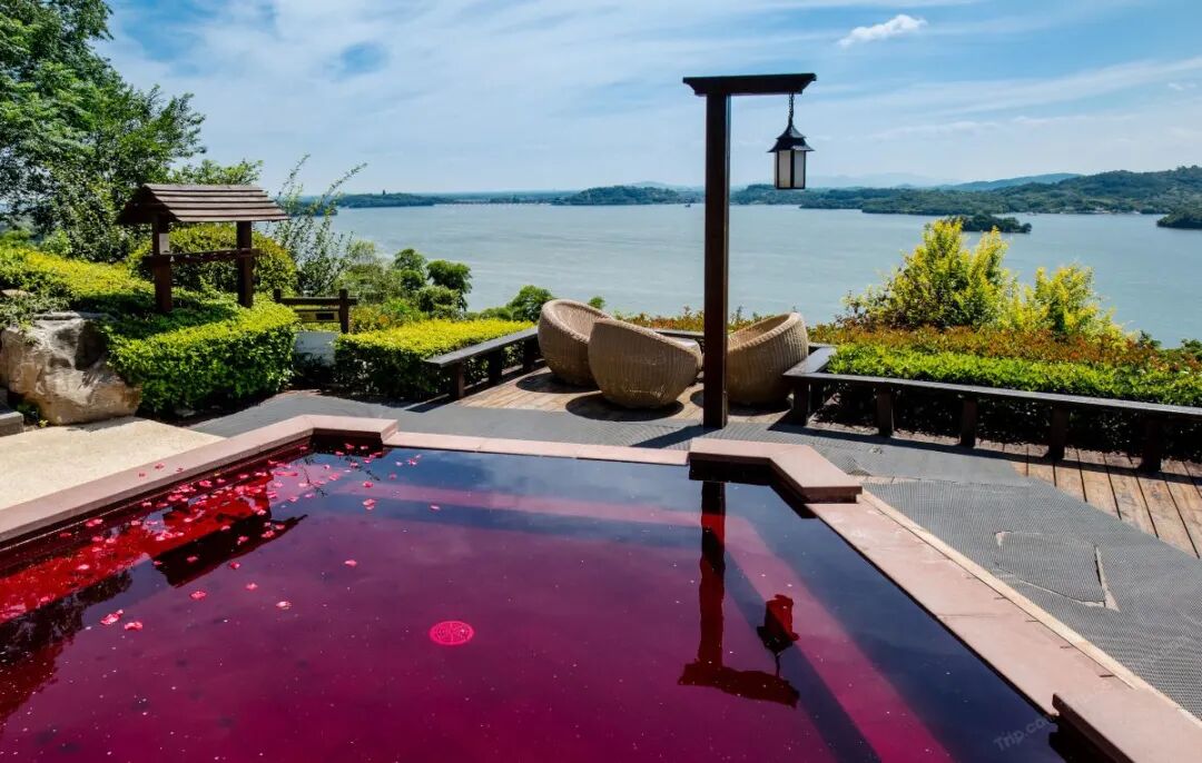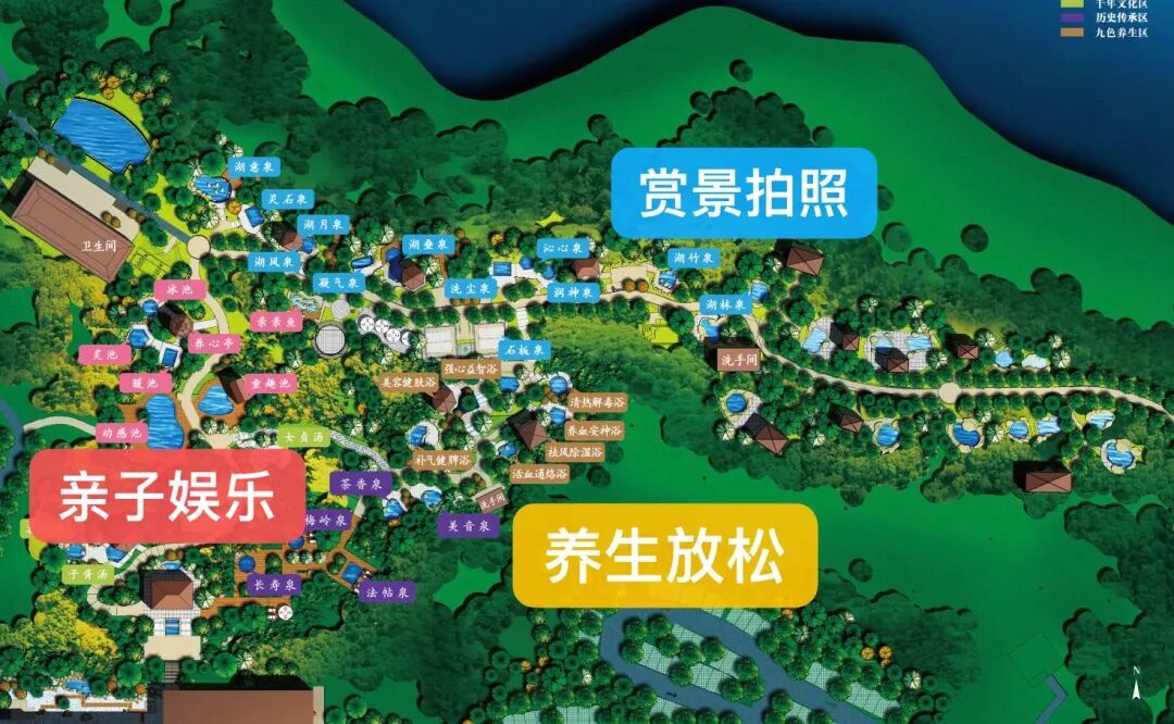 泡池足足有40+,带孩子的可以去红色区,有童趣池、鱼疗池等;看风景拍大片的去蓝色区,每一个都是C位湖景;养生放松的去黄色区,各种草药泡池,堪比十次大保健。