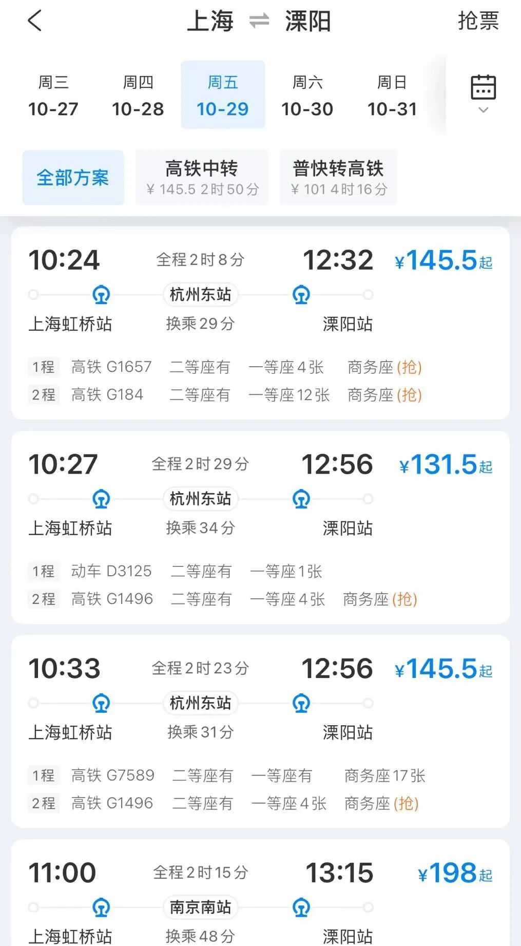 建议先坐到南京、杭州,再转车到溧阳,车次比较多,中转一般半个小时以内。